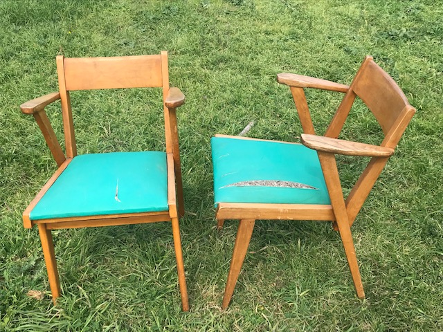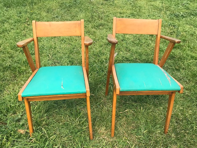 Paire de bridge 1950 en bois, assise en skaï vert.